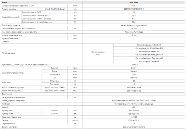 - wydajność oczyszczania powietrza: CADR 600 m³/h