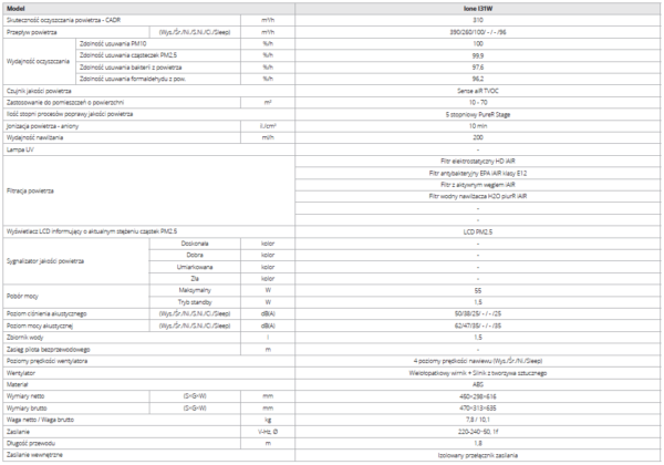 Ione to urządzenie, które idealnie nadaje się do filtracji oraz nawilżania powietrza w naszych mieszkaniach (pokojach lub sypialniach). Podczas 1h pracy oczyszczacz skutecznie filtruje aż 310 m³ powietrza i nawilża z wydajnością 200 ml/h.