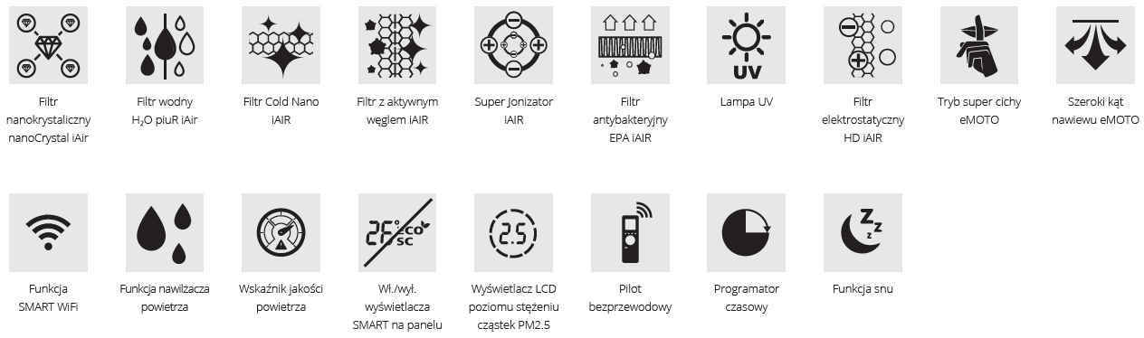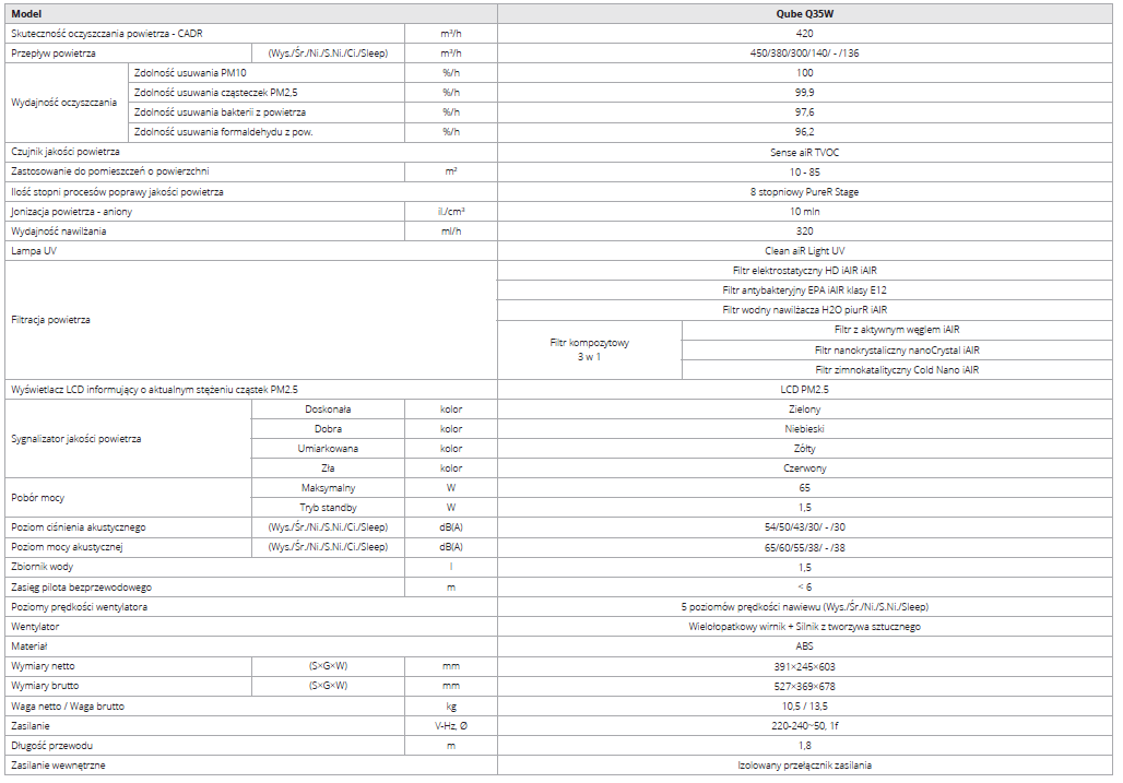 W oczyszczaczu zachodzi 8-etapowa filtracja powietrza. Qube posiada filtr elektrostatyczny, filtr EPA iAIR klasy E12, filtr wodny nawilżacza H2O piurR iAIR oraz filtr kompozytowy 3 w 1, w którego skład wchodzą filtry: z aktywnym węglem iAIR, nanokrystaliczny nanoCrystal iAIR i zimnokatalityczny Cold Nano iAIR. Dodatkowo powietrze jest sterylizowane wiązką promieniowania UV. Ostatnim, ósmym etapem filtracji jest uzupełnienie powietrza w jony ujemne przez Super Jonizator iAIR. Poprzez wytworzenie ujemnych jonów w ilości do 10 mln/cm³ filtr eliminuje z powietrza wirusy, bakterie, roztocza oraz alergeny. Nieprzyjemne zapachy zostają wyeliminowane praktycznie natychmiast po kontakcie jonizatora z zanieczyszczonym powietrzem
